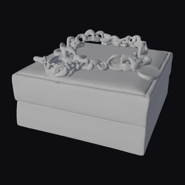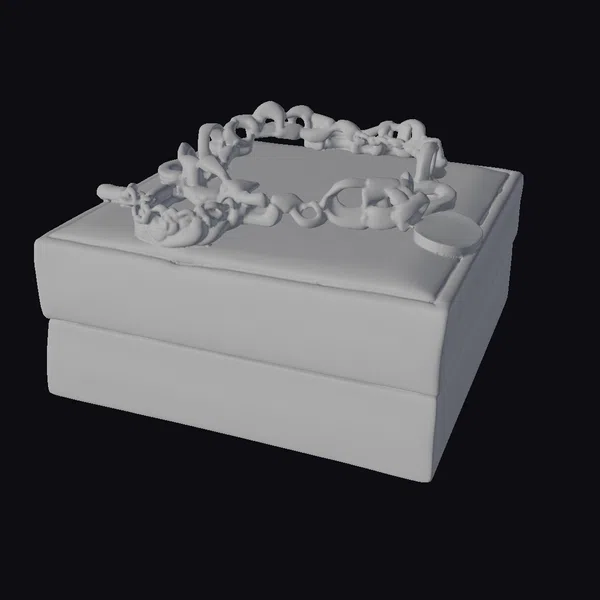 Positioned atop a cream-colored jewelry box with a soft, padded top, the golden heart chain bracelet is a vision of luxury. The bracelet itself is composed of intricately linked gold hearts, each one meticulously detailed to capture the essence of elegance. The clasp, securely fastened, ensures the bracelet can be worn with confidence. The shiny, gold finish not only adds to the bracelet’s allure but also highlights the precision in its design. The cream-colored box, with its clean lines and simple elegance, serves as a perfect backdrop, allowing the bracelet to take center stage. This setup is ideal for those looking to add a touch of sophistication to their digital projects, whether for games, print, VR/AR experiences, animation, or design purposes.