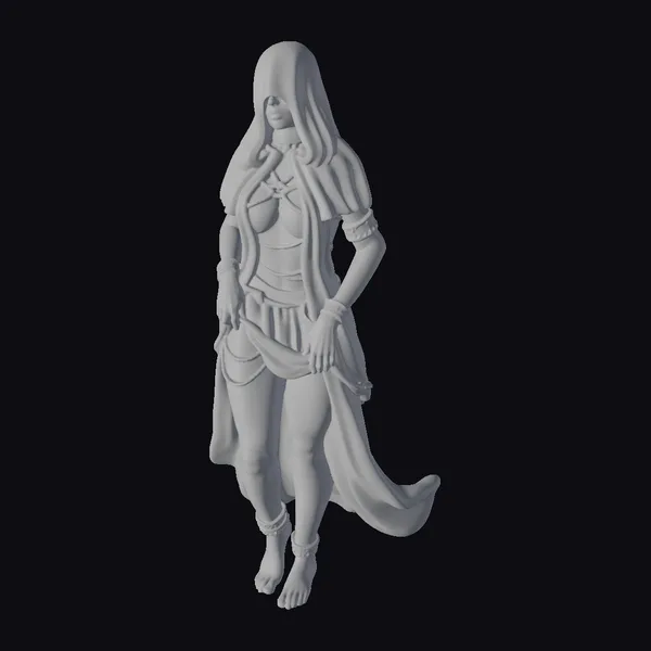 Detailed from every angle, this stylized 3D model showcases a female character with a golden hooded cloak and matching costume. The intricate gold jewelry adorning her wrists, ankles, and torso catch the light, suggesting a setting of mysticism and ancient lore. Her facial features are subtly defined under the hood, inviting the viewer to ponder her story. The model is highly detailed, with textures and lighting that bring out the golden hues and fabric folds dynamically. Ideal for use in fantasy games, animations, or as a decorative piece in virtual environments.