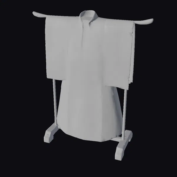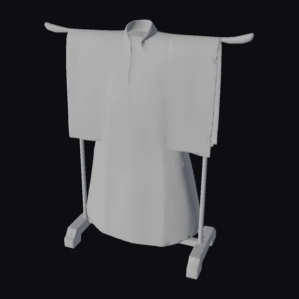 Suspended from a wooden stand, the kimono’s fabric comes alive with a swirling vortex of golden, black, and white clouds, meticulously crafted to create a sense of movement and fluidity. The garment’s traditional Japanese design is characterized by its elegant sleeves and body, adorned with an intricate pattern that seems to shift and shimmer in the light. The kimono’s texture appears smooth and luxurious, inviting the viewer to appreciate the craftsmanship that has gone into its creation. Whether for fashion design, cultural exploration, or simply as a testament to the beauty of traditional Japanese attire, this 3D model of the golden kimono with clouds is a captivating addition to any project. Its potential applications span across various fields, including game development, animation, virtual reality, and architectural visualization.