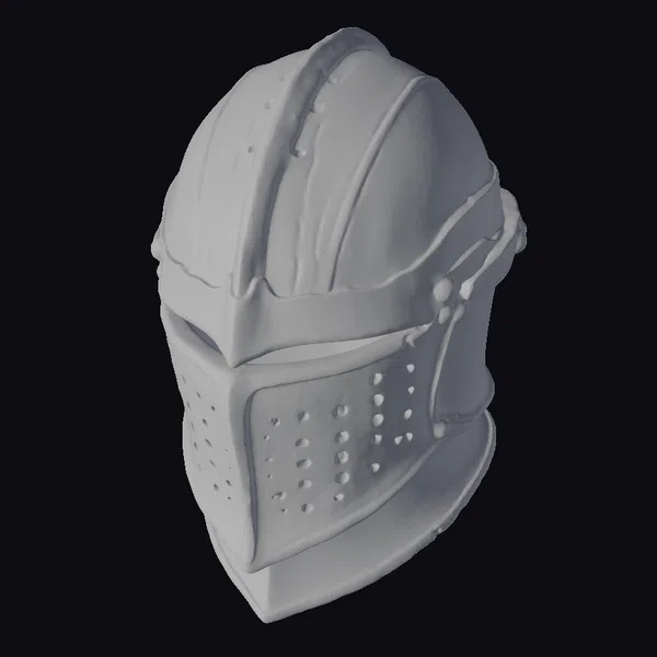 Positioned at a slight angle, the helmet showcases its impressive design, complete with riveted panels, a pointed chin guard, and a visor perforated with rows of small holes for ventilation. The metallic surface gleams with a subtle sheen, accentuated by golden trimmings that add a touch of luxury. The level of detail, from the slight weathering on the metal to the precision of the gold accents, makes this piece a standout. Ideal for historical reconstructions, fantasy settings, or as a striking decorative piece, this model promises to add authenticity and drama to any project. Whether for game development, animation, or architectural visualization, its presence commands attention and respect.