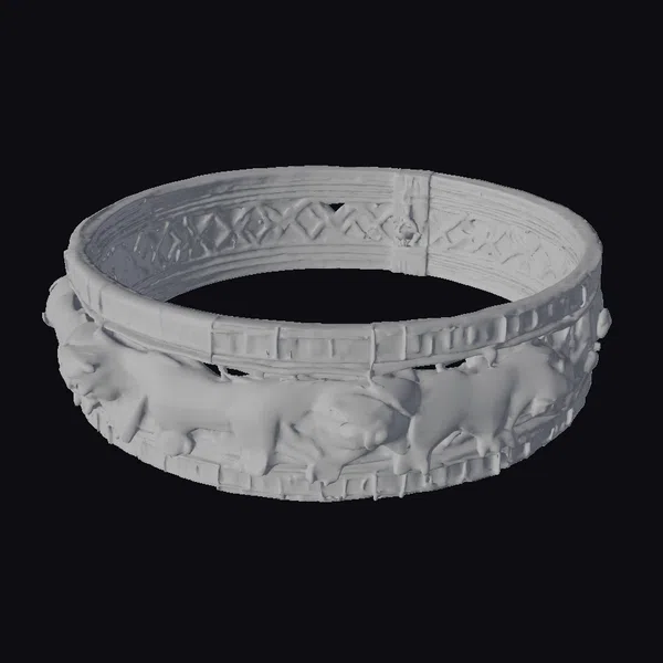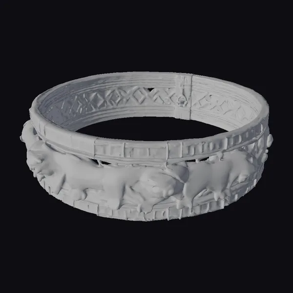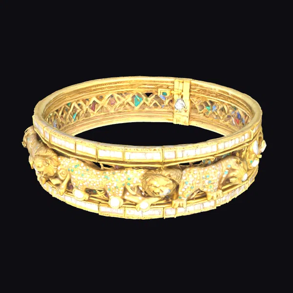 Crafted with meticulous attention to detail, the bangle features two regal lions that appear to be walking along its circumference, each adorned with sparkling stones that catch the light. The golden metalwork is intricate, with a lattice pattern on the inside and a border of white stones around the outside, adding to its ornate design. The bangle’s clasp is securely fastened, ensuring it stays in place. Its vintage style and luxurious materials make it a standout piece of jewelry. Ideal for use in games, 3D printing, VR/AR experiences, animation, and design projects where a touch of elegance and history is desired.
