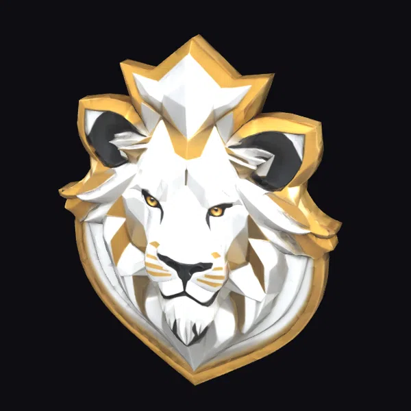 Intricately designed with a stylized lion’s head at its center, this golden emblem commands attention with its bold, sharp features and regal demeanor. The lion’s white fur is contrasted with vibrant gold and black accents, bringing out the fierce yet noble expression. Positioned within a shield-like gold border, adorned with a starburst pattern at the top, the emblem speaks to themes of courage and strength. The stylized, somewhat cartoonish approach to the design gives it a versatile appeal, suitable for various applications ranging from game assets and animations to print and digital designs. Its detailed textures and balanced color scheme ensure it stands out in any context.