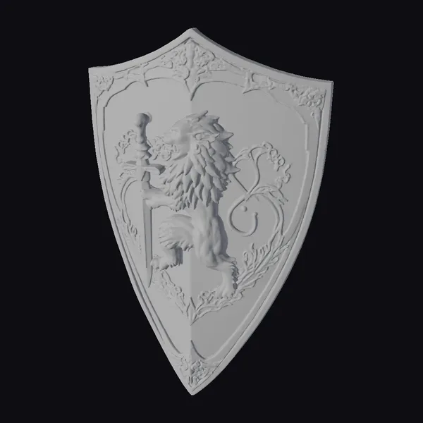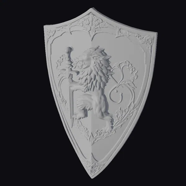 The Golden Lion Shield boasts a striking design, featuring a powerful lion standing proudly on its hind legs, grasping a sword in its right paw. The lion’s shaggy mane and detailed fur texture leap off the shield, set against a mottled gray background that resembles worn stone or metal. A delicate golden border frames the shield, adorned with ornate filigree that adds a touch of medieval grandeur. Ideal for use in games, animations, or designs seeking a symbol of courage and strength, this model is sure to make a lasting impression.