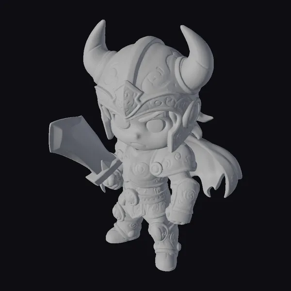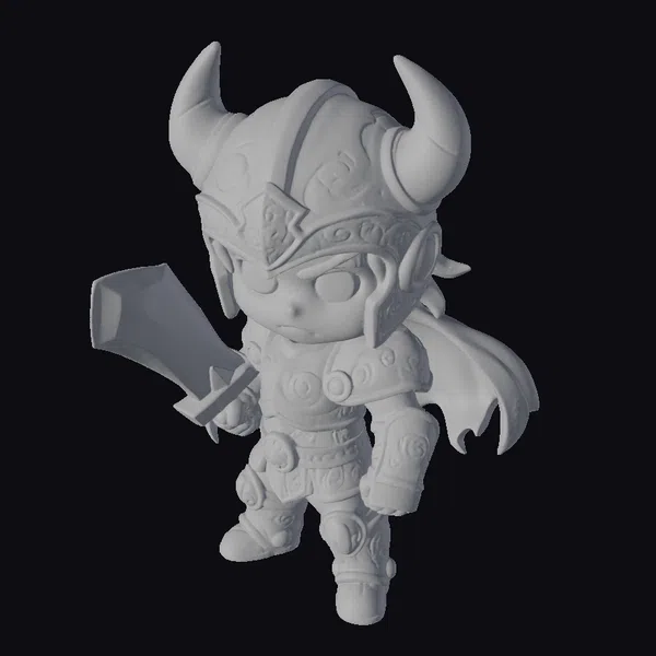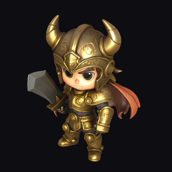 In a dynamic pose, this tiny warrior hero stands ready for battle, clad in ornate golden armor that glistens with detailed engravings. The horned helmet adds a mythical touch, while the large sword at the ready suggests a story of courage and quest. The character’s chibi-style features – large eyes, small nose, and rosy cheeks – bring a delightful contrast to the heroic gear. A flowing cape billows behind, suggesting movement and energy. This model is ideal for use in games, animations, or virtual reality experiences where a dash of fantasy and heroism is needed. Its small scale and vibrant appearance make it versatile for various creative projects.