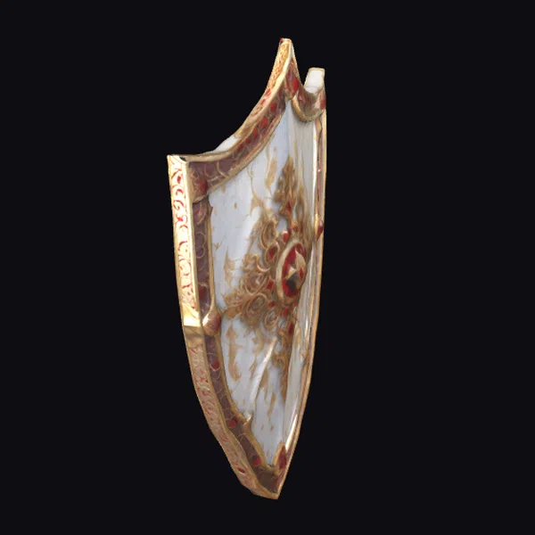 Positioned dynamically, the shield showcases its white base adorned with swirling golden filigree that borders the shield’s sharp, angular edges. The golden accents shimmer with a sense of luxury and craftsmanship, while the red highlights add a touch of boldness. The shield’s design speaks to a rich history, perfect for use in games, 3D printing, VR/AR experiences, or animation projects where a symbol of paladinhood is required. Its detailed texture and ornate patterns make it a versatile asset for various creative endeavors.