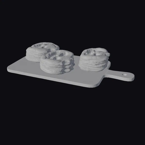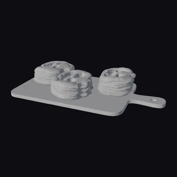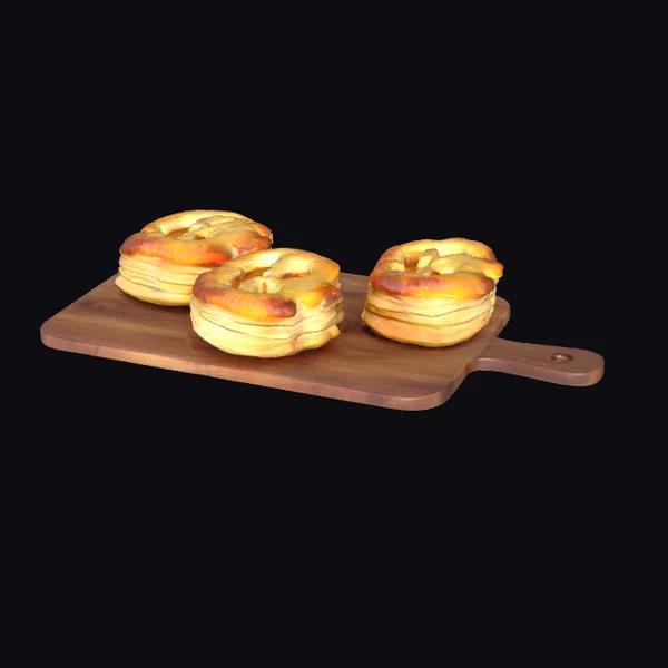 Detailed to perfection, these golden pastry pumpkin faces boast a realistic texture that mimics the flaky, buttery layers of a freshly baked pastry. Positioned on a rustic wooden cutting board, the three pastries are angled to showcase their intricate designs and the subtle sheen of a golden-brown crust. The soft lighting accentuates the depth of their pumpkin-inspired features, making them a delightful addition to any 3D scene, whether for animation, game design, or architectural visualization. Their autumnal charm can add a seasonal touch to projects ranging from advertising and marketing materials to virtual reality experiences.