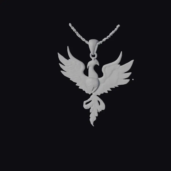 Crafted with meticulous attention to detail, this stunning phoenix pendant is a masterclass in design. Its body and wings are rendered in golden metal, with each feather meticulously shaped and textured to convey a sense of movement and life. The phoenix’s wings are spread wide, as if in mid-flight, and its long tail feathers flow elegantly downwards. A large, oval gemstone in a warm, fiery red-orange hue is set within the phoenix’s chest, adding a touch of luxury and mystique. The pendant is suspended from a delicate chain, which adds a touch of subtlety to the overall design. This piece would be perfect for use in games, 3D printing, VR/AR experiences, animation, or design projects where a touch of fantasy and elegance is desired.
