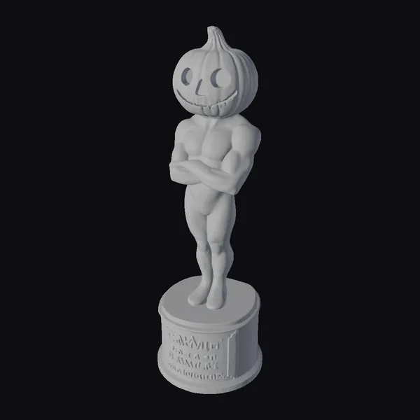 This stunning golden pumpkin statue is meticulously detailed, from the subtle texture of the pumpkin head to the defined muscles of the golden body. The figure stands confidently with arms crossed, its large, black eyes and stitched smile exuding a playful yet eerie charm. The black base, adorned with a gold-engraved ‘Halloween’ message, adds a touch of sophistication. Ideal for Halloween enthusiasts and collectors, this model is perfect for 3D printing, game development, or as a unique decorative piece. Its stylized design ensures it stands out in any setting, from virtual environments to real-world displays.