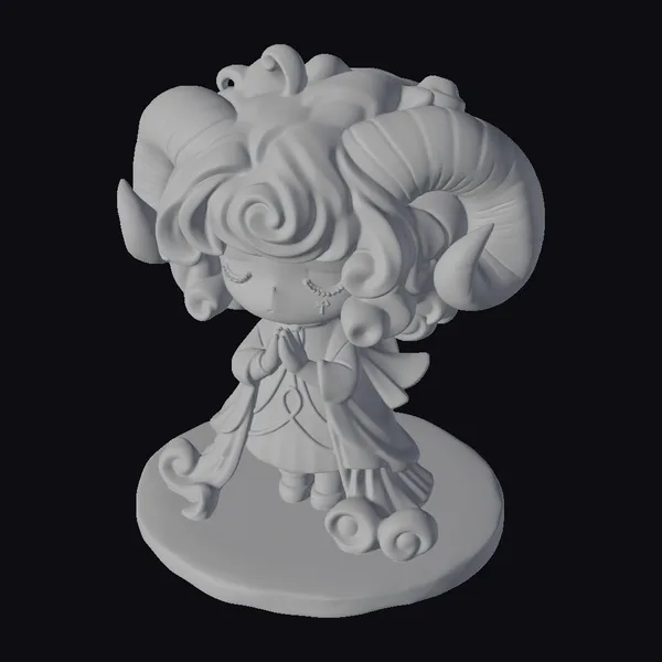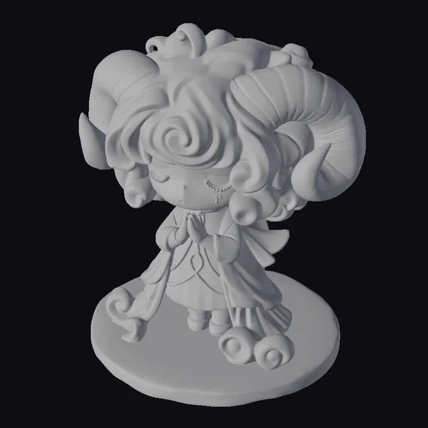 This captivating figurine showcases a ram with a stylized, almost angelic appearance, featuring a voluminous white coat and impressively curved golden horns that seem to radiate an inner light. The ram’s facial features are delicately defined with a subtle pink hue, adding a touch of warmth to its overall mystical aura. Clad in a detailed white robe embellished with golden lines, the figurine stands in a contemplative pose, hands clasped together. The base, with its concentric circles and swirling motifs, complements the figurine’s base with a harmonious blend of form and texture. Ideal for enthusiasts of fantasy and mythology, this model is perfect for use in games, 3D printing, virtual reality, animation projects, and design applications.