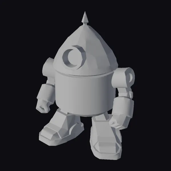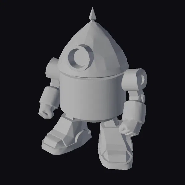 Standing with a slight tilt, this golden robot showcases its unique design. The cone-shaped head features a large blue eye and a small spike on top, while its body and limbs are adorned with metallic panels and joints. Two small blue lights add a touch of personality to its chest and eye. The robot’s pose suggests a sense of approachability and curiosity. Its stylized appearance makes it perfect for various creative projects, including games, animations, and designs where a friendly robot character is needed.