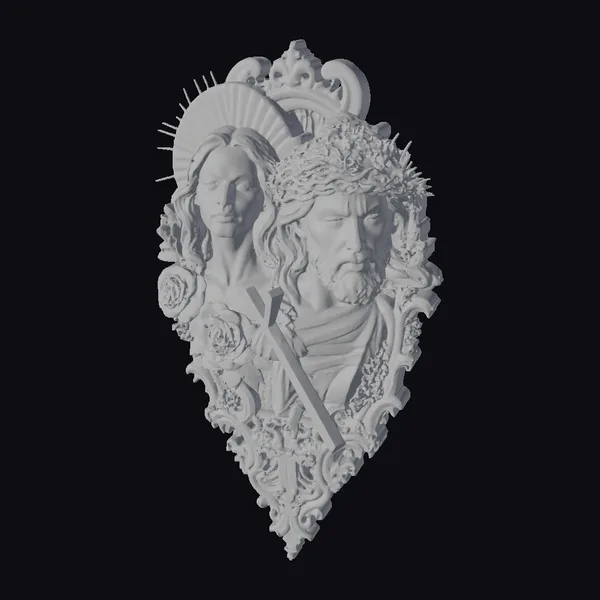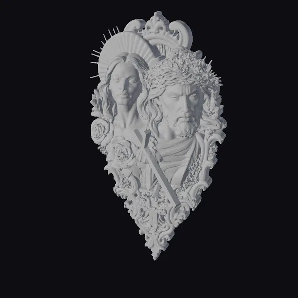This stunning gold relief presents a serene and sacred scene, featuring two heads rendered in exquisite detail. The female figure, adorned with a halo and flowing locks, stands alongside a bearded male figure crowned with thorns, his expression solemn. A delicate floral arrangement and ornate gold framework add to the piece’s opulence. The relief’s pointed base and curved top, complete with a smaller crown, frame the divine duo. Ideal for use in games, 3D printing, VR/AR experiences, animation, and design projects, this model brings a touch of the sacred to any creative endeavor.