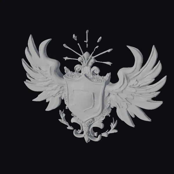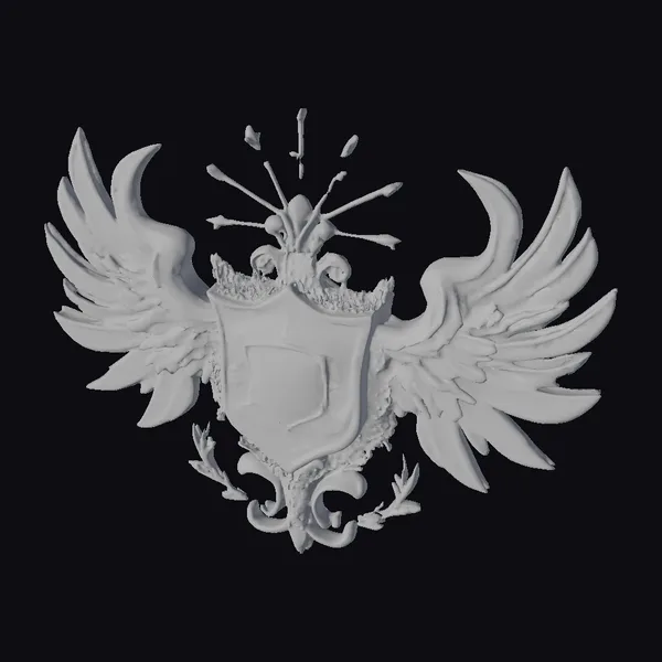 Positioned dynamically with wings outstretched, this emblem commands attention with its intricate details and vibrant color scheme. The shield boasts a weathered, silver-gray finish adorned with a gold border and a solid gold inner shield, topped with a star that adds a touch of celestial magic. The wings, transitioning from gold to silver, appear as if caught in mid-flutter, enhancing the emblem’s dramatic flair. A golden filigree frame surrounds the shield, with decorative flourishes that add to its opulence. Ideal for use in games, animations, and designs requiring a symbol of heroism and prestige, this emblem can be adapted for various applications including 3D printing, virtual reality experiences, and high-end graphic design projects.