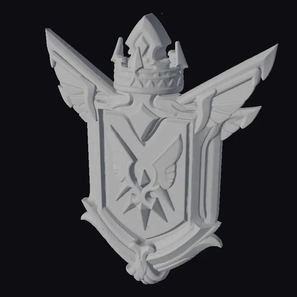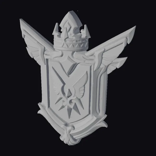 Positioned dynamically, the golden shield emblem takes center stage with its intricate details and ornate design. The royal crown atop the shield adds a touch of regality, while the majestic wings on either side evoke a sense of power and freedom. The blue background provides a striking contrast to the golden accents, drawing attention to the emblem’s symbolic design. Crafted with precision, this emblem is perfect for use in games, 3D printing, VR/AR experiences, animation, and design projects, where a touch of fantasy and sophistication is desired.