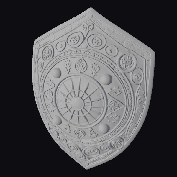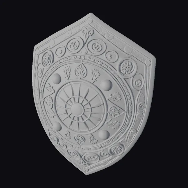 The Golden Shield with Blue Gem boasts a richly detailed design, featuring a large blue gemstone surrounded by a series of concentric circles and ornate patterns. The shield’s surface is rendered in a warm, golden hue, with a subtle texture that suggests a sense of age and wear. The blue gemstone at the shield’s center seems to glow with an inner light, adding to the overall sense of mystique and power. This shield would be perfect for use in a variety of applications, including games, animations, and 3D print projects, where a touch of fantasy and adventure is needed.