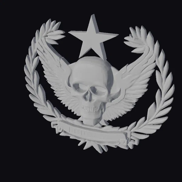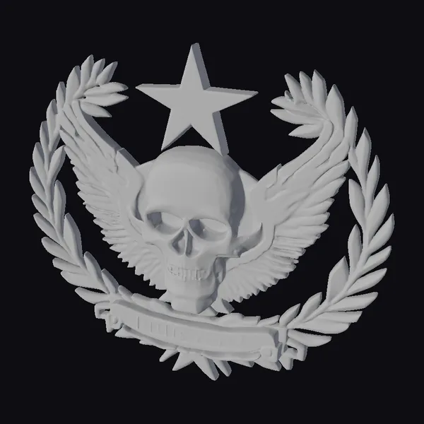 The Golden Skull Emblem presents a striking visual composition, with a central skull boasting sharp cheekbones and hollow eyes, rendered in exquisite detail. The skull is adorned with wings on either side, adding a dynamic element to the design. Atop the skull, a five-pointed star shines brightly, while a laurel wreath encircles the emblem, symbolizing honor and achievement. The banner at the bottom, inscribed with ‘UNTRBEITT’, adds a layer of intrigue. This emblem is perfect for use in various projects, including games, 3D printing, virtual reality, and animation, where a touch of military flair and mystery is desired. Its stylized and ornate design ensures it stands out in any context.