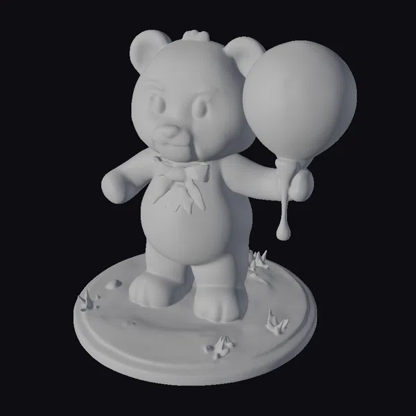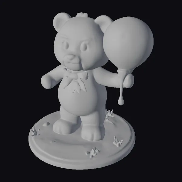 Crafted with meticulous detail, this charming teddy bear figurine is made to resemble white chocolate, complete with a smooth, creamy texture that seems almost edible. The bear stands on a round base designed to look like snow, flecked with golden accents that catch the light. A bright red bow tied around its neck adds a pop of color, complemented by a clear gem that shines like a tiny jewel. In one paw, the teddy grasps a large, reflective gold balloon, its shiny surface mirroring light. Ideal for games, 3D printing, VR/AR experiences, animation projects, or as a design reference, this model brings a touch of whimsy and delight to any creative endeavor.