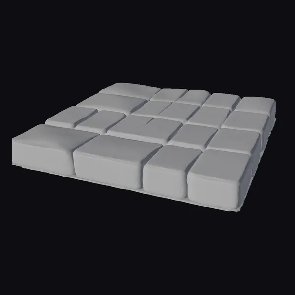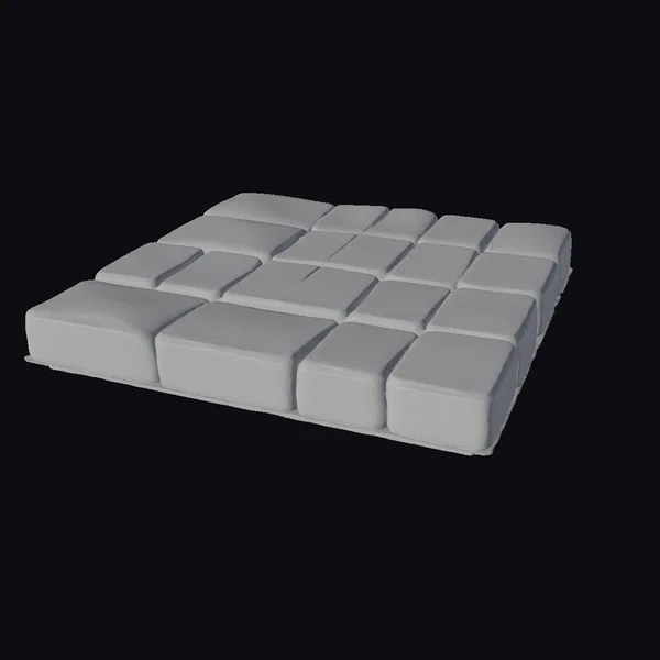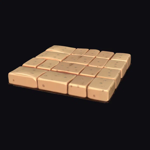 Floating dynamically in a seemingly endless expanse, a meticulously crafted arrangement of golden tiles commands attention. Each tile boasts a rectangular shape with slightly rounded edges, contributing to the overall sense of refinement. The surface of every tile is adorned with small, circular indentations, adding a layer of depth and visual interest. The tiles themselves exhibit a warm, golden hue with a subtle sheen, reminiscent of stone but imbued with a luxurious metallic glow. When viewed collectively, the tiles form a captivating pattern that could serve as a focal point in various creative projects, from game environments and architectural visualizations to animations and 3D printed decorative pieces.