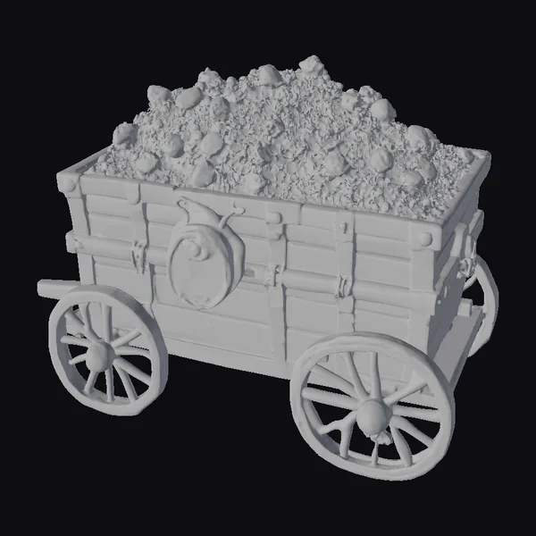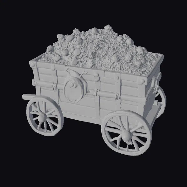 Deep in the heart of a mystical forest, a wooden treasure cart sits laden with a bounty of golden riches. The cart itself is crafted from sturdy wooden slats, reinforced with brass straps and rivets, and features a pair of solid wooden wheels with iron rims. The cart’s wooden handle and decorative wheel on the side add to its rustic charm. The treasure within is a dazzling assortment of gold coins, bars, and nuggets, piled high and reflecting the light in a mesmerizing display of wealth. This 3D model is perfect for use in games, animations, or 3D printing projects where a touch of fantasy and opulence is desired.
