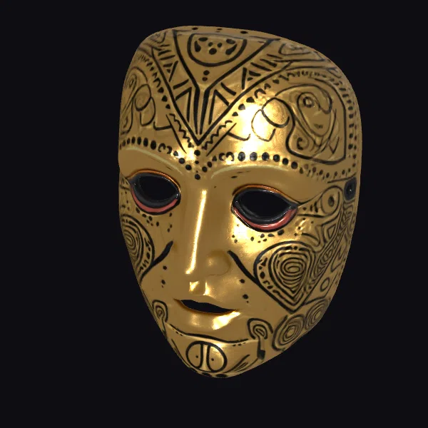 This stunning golden tribal face mask is meticulously detailed with a variety of black patterns that dance across its surface. The mask’s shiny finish catches the light, accentuating its ornate design. With a stylized approach to tribal art, this mask is perfect for projects requiring a touch of mystery and allure. Ideal for use in games, 3D printing, VR/AR experiences, animation, and design projects, this model is sure to add a unique element. The mask’s proportions and details are finely tuned, ensuring a realistic and captivating appearance.