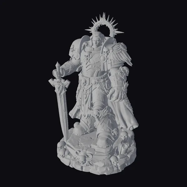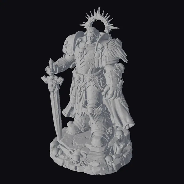 In a dynamic pose of readiness, the warrior’s gold armor shines with intricate details, complemented by a vibrant red cape flowing behind. A golden halo encircles his head, symbolizing his divine right to command. The blue sword, held firmly in his hand, contrasts sharply with the dark, stone base that is strewn with skulls, hinting at his conquests. This model is perfect for use in games, 3D printing, VR/AR experiences, animation, and design projects, offering a rich, detailed character with a strong narrative presence.