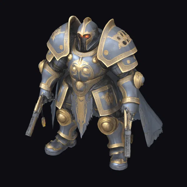 Detailed with precision, this Gothic armor knight stands proudly, its heavy plate armor a testament to medieval craftsmanship with a steampunk twist. The armor’s gray and gold color scheme exudes a sense of luxury and power. Its flintlock pistol gauntlets are a marvel of fictional technology, suggesting a world where medieval and science fiction collide. The model’s intricate details, from the tattered cape to the red glowing eyes, invite you to explore a world of fantasy and adventure. Ideal for projects requiring a blend of historical and futuristic elements, such as games, animations, or 3D printing.