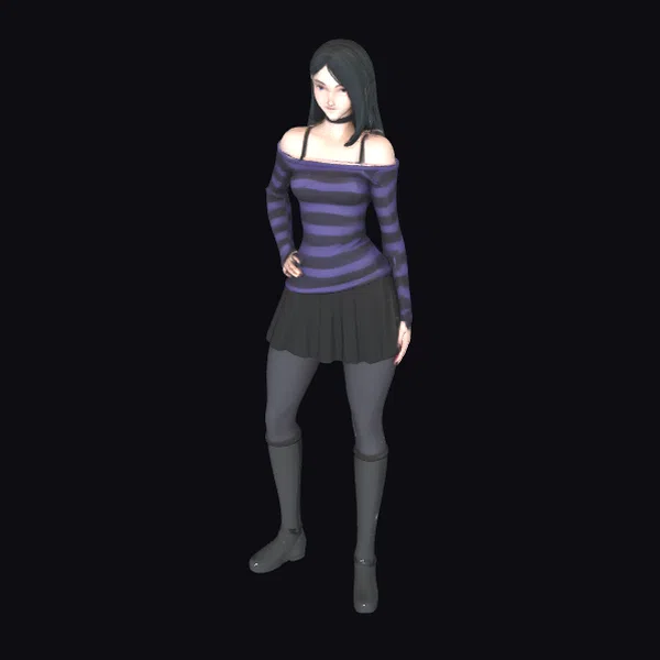 Detailed with precision, this stylized 3D model showcases a female character in a pose that exudes confidence and poise. Her purple and black striped top is off-the-shoulder, revealing a delicate neckline, paired with a short black skirt that adds a touch of playfulness to her overall gothic elegance. The model is dressed in tights and knee-high boots, completing her outfit with a sense of sophistication. Her long, straight black hair cascades down her back, framing her face with simplicity and elegance. The model’s facial features are stylized, contributing to her anime-inspired look. This 3D model is perfect for projects requiring a character with a gothic yet stylish vibe, suitable for use in animations, games, virtual reality experiences, and more.