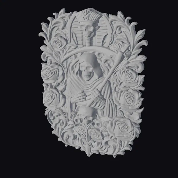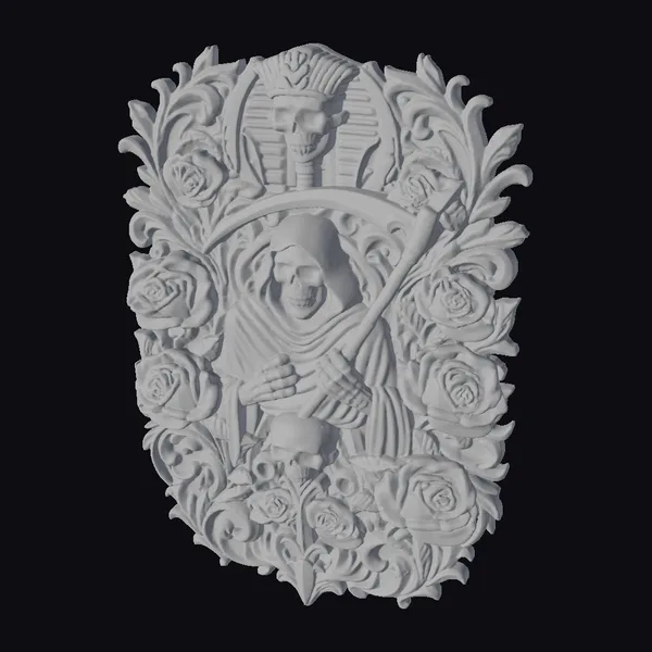 Intricately detailed and richly textured, the grim reaper at the center of this plaque is a masterclass in stylized design. The skeleton’s hooded figure is draped in folds of dark fabric, grasping a scythe that curves elegantly above its head. A smaller skull rests at its feet, adding to the macabre beauty. The grim reaper is encircled by a dozen vibrant red roses, their petals delicately rendered and colored. The gold frame bursts with ornate details, including swirling leaves and tendrils that dance around the grim reaper. At the top, an Egyptian-inspired skull adds an air of mystique. This plaque would be a striking addition to any dark or gothic-inspired space, and its intricate details make it perfect for use in games, 3D printing, VR/AR experiences, animation, and design projects.