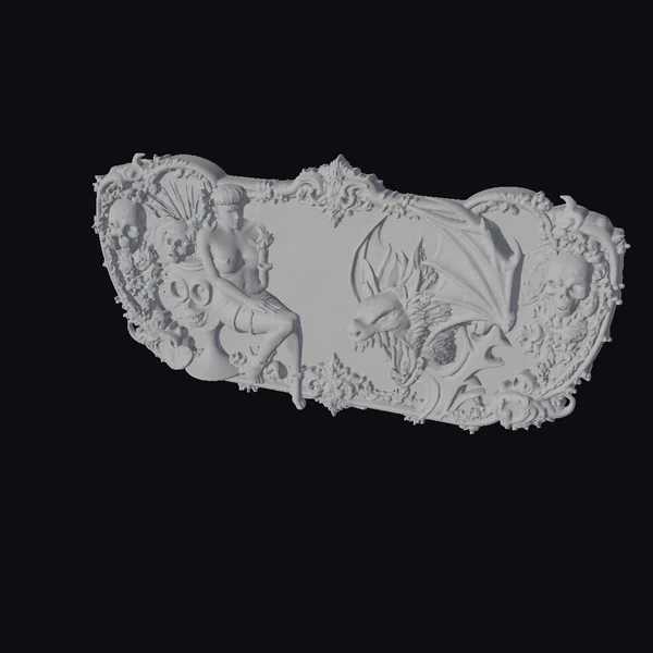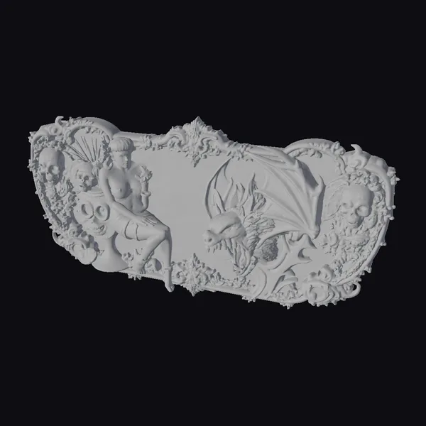 Delving into the darker side of fantasy, this 3D model presents a vivid scene of contrasts, where elegance meets the macabre. The woman, dressed in a sleek black outfit, exudes an air of mystique as she sits next to a fearsome bat creature with glowing eyes. The scene is encased in an ornate frame adorned with skulls, adding to the gothic ambiance. The level of detail in the textures, lighting, and the intricate design of the frame makes this model perfect for projects requiring a touch of dark fantasy. Ideal for use in games, 3D printing, VR/AR experiences, animations, and designs that call for a unique blend of beauty and darkness.