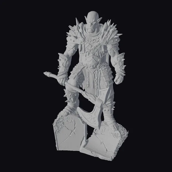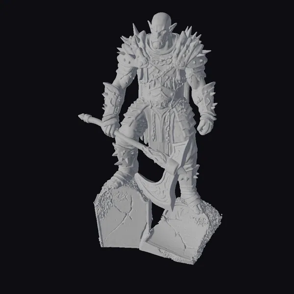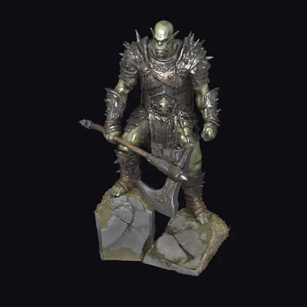 This imposing orc warrior statue stands tall, its greenish hue and bald head accentuating its menacing presence. Adorned in dark, spiky armor that covers its torso, arms, and legs, the orc exudes a sense of formidable strength. The warrior’s facial features are chiseled, with sharp, pointed ears adding to its otherworldly appearance. A large Viking axe, grasped firmly in its hand, further amplifies its intimidating stance. Positioned on a broken grave stone, the statue embodies a dark, gothic aesthetic, perfect for projects requiring a touch of dark fantasy. The intricate details, from the texture of the armor to the ruggedness of the stone, make this model a compelling addition to any 3D design or gaming project.