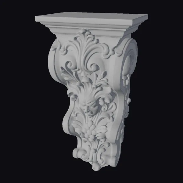 Positioned at a dynamic angle, the corbel’s ornate details leap into focus. The golden and green hues blend seamlessly, with light reflecting off the smooth surfaces. The woman’s face, nestled within the curves of the corbel, appears serene, her features finely detailed. Floral patterns weave around her, culminating in a sturdy base that supports the flat, marbled stone top. This piece would be perfect for adding a touch of gothic grandeur to games, animations, or architectural visualizations. Its intricate design and high level of detail make it suitable for close-up shots or as a decorative element in larger scenes.