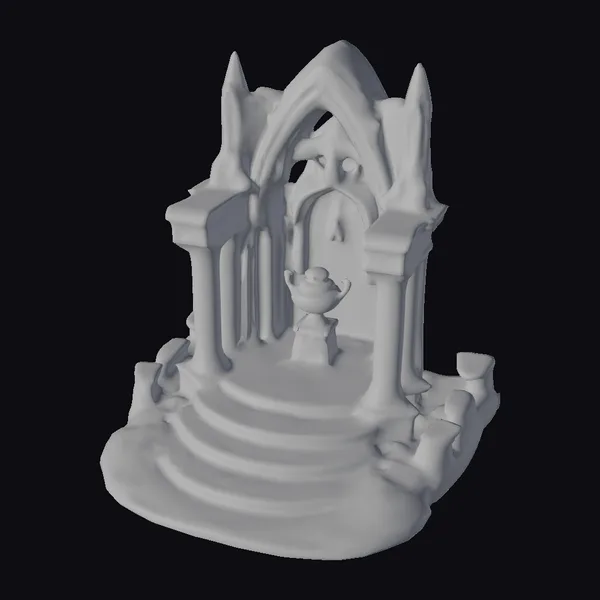 Perched atop a series of worn stone steps, the shrine’s facade is a marvel of intricate design, with delicate carvings that tell stories of a long-forgotten era. The pointed arch, a hallmark of Gothic architecture, frames a smaller, equally ornate doorway, hinting at the secrets within. As moss and greenery claim the structure as their own, the shrine seems to blend seamlessly into its surroundings, becoming one with the landscape. The central urn, perched on a simple pedestal, adds a touch of solemnity to the scene. This 3D model is perfect for game developers, architects, and designers looking to add a touch of ancient mystique to their projects, whether for print, VR/AR experiences, animation, or conceptual design.