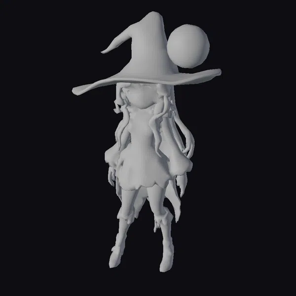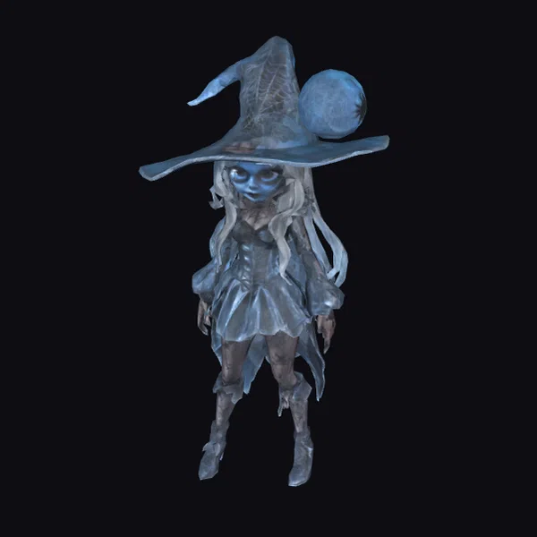In a pose that commands attention, the gothic witch model showcases intricate details, from the tattered edges of her blue and gray dress to the elaborate design on her broken wizard hat. The hat, with its wide brim and towering height, is covered in a spider web and topped with a large, glowing blue orb shaped like a full moon, suggesting a deep connection to lunar magic. Her face, painted in shades of blue, features eyes that seem to gleam with an inner light, adding to her enigmatic presence. Long, flowing white hair cascades down her back, partially obscuring her shoulders and framing her face. The model is set against a plain white background, allowing her to stand out. This 3D model is perfect for projects requiring a character with a strong, mystical presence, suitable for games, animations, VR/AR experiences, and design projects that require a touch of dark fantasy.