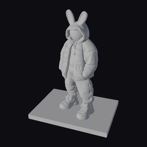 Detailed in every aspect, this graffiti bunny stands proudly on a pink base adorned with a floral pattern, its graffiti-covered jumpsuit and sneakers showcasing a kaleidoscope of colors and patterns. The bunny’s hood is up, revealing pink bunny ears that add a playful touch. The face, hidden from view, maintains the mystery and allure of this urban character. Crafted with precision, this model is ideal for animations, games, or any project requiring a unique, stylized character with a strong aesthetic appeal. Its stylized features and vibrant colors ensure it stands out, making it a versatile addition to various creative endeavors.