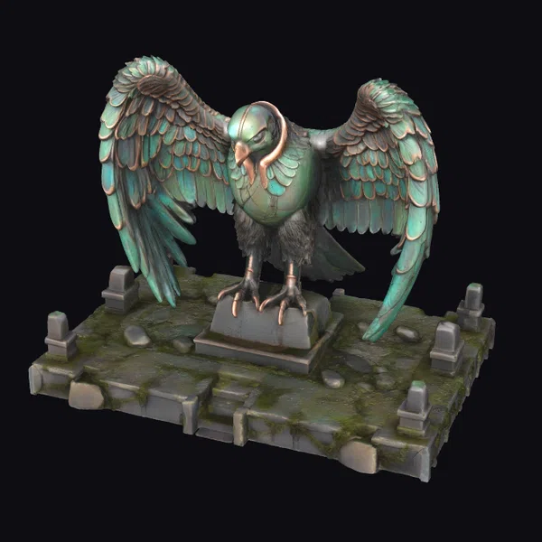 This stunning condor guardian statue is meticulously detailed, from the intricate feathers on its body to the textured stone base it stands on. The wings, outstretched and strong, showcase a mesmerizing blend of dark granite and aged copper, with a beautiful verdigris patina that adds a touch of mystique. The base, covered in moss and small stones, appears as if the statue has stood watch for centuries. Ideal for use in games, 3D printing, VR/AR experiences, animation, and design projects, this model brings a touch of fantasy and protection to any scene. The condor’s sharp talons and alert posture convey a sense of readiness, as if guarding a treasure or a sacred place.