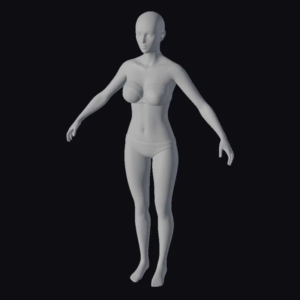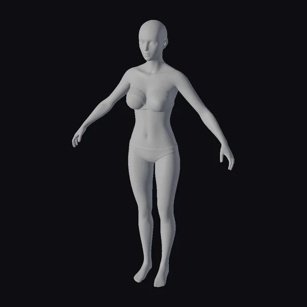 Detailed with precision, this gray female body model showcases a realistic human form. Her pose, with arms slightly extended and legs straight, offers a clear view of her anatomy. The model features a bald head, smooth gray skin, and a slim yet curvaceous physique. The lack of clothing allows for a full appreciation of her body shape and proportions. Her facial features are subtle, with a calm expression. This model is ideal for use in 3D animation, game development, virtual reality experiences, and anatomical studies. Its realistic style and detailed texture make it a valuable asset for creators looking for a lifelike character model.