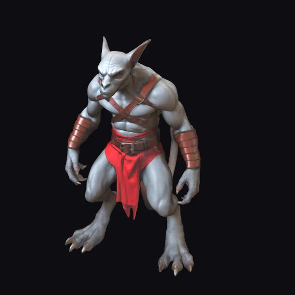 Crafted with meticulous attention to detail, this gray gargoyle warrior 3D model boasts an imposing stance, with its weight shifted onto its right leg and left leg bent in a ready position. The texture of its gray skin and the intricate design of the red leather armor are finely detailed, inviting the viewer to explore every nook. The gargoyle’s facial features are a blend of humanoid and bat-like, with sharp, pointed ears and a stern expression. Its sharp claws are outstretched, as if prepared to strike. This model is perfect for projects requiring a mythical creature with a dark, aggressive vibe, suitable for use in games, animations, VR/AR experiences, and architectural visualizations.