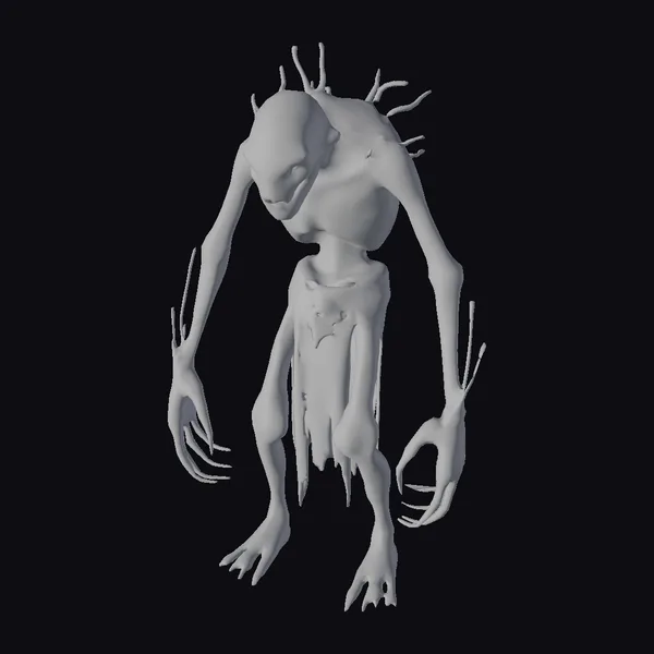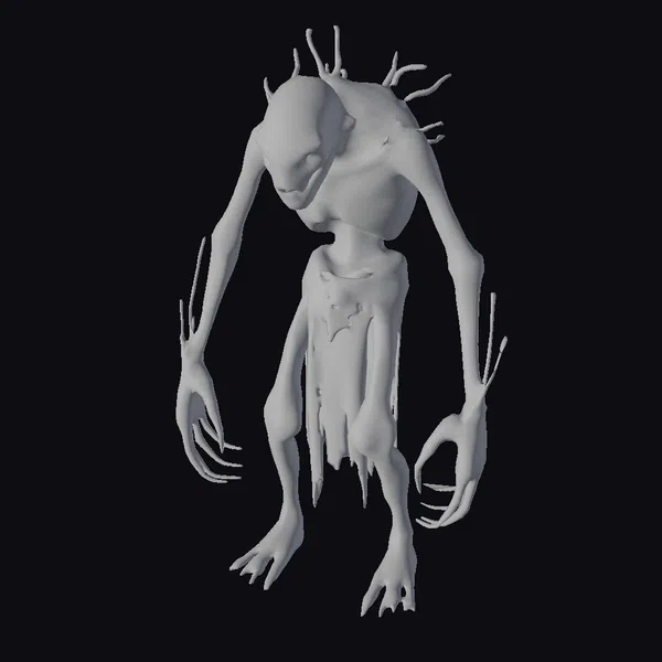 Standing tall with an unsettling presence, this gray ghoul creature model boasts a detailed skeletal structure covered in a tattered, dark material that seems to be melting off its body. The long, spindly limbs are tipped with sharp claws, ready to snatch or swipe at unsuspecting victims. Protrusions on its head add to its alien, monstrous appearance. The model’s high level of detail, from the texture of its skin to the folds of its tattered clothing, makes it an excellent choice for horror-themed games, animations, or 3D prints. Its eerie, ghostly appearance is sure to send shivers down the spine, making it a great asset for projects that require a creepy, supernatural element.