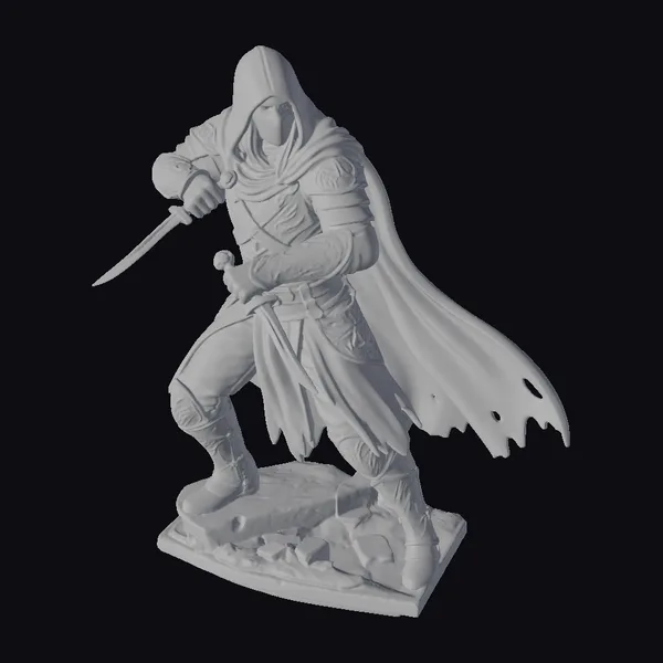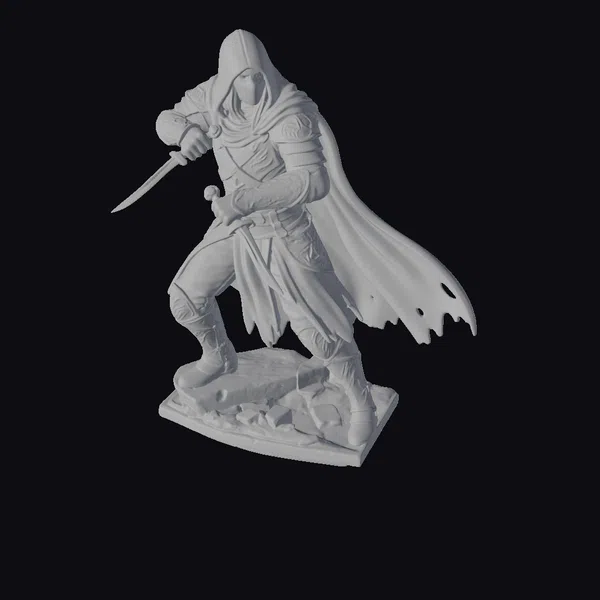 Crafted with meticulous attention to detail, this gray hooded assassin figurine showcases a dynamic pose, with the character’s body angled and knees slightly bent, as if prepared to spring into action. The dual swords, one held high and the other at the side, emphasize the character’s readiness for combat. The stylized design blends fantasy and realism, with intricate details on the armor and a tattered cape that flows behind the figure. The base, designed to resemble a rocky outcrop, adds texture and context to the scene. This model is perfect for use in games, 3D printing, VR/AR experiences, animation projects, and design visualizations, offering a versatile and captivating character asset.