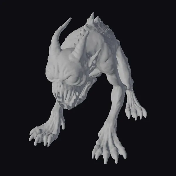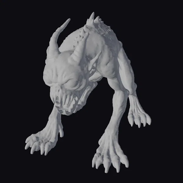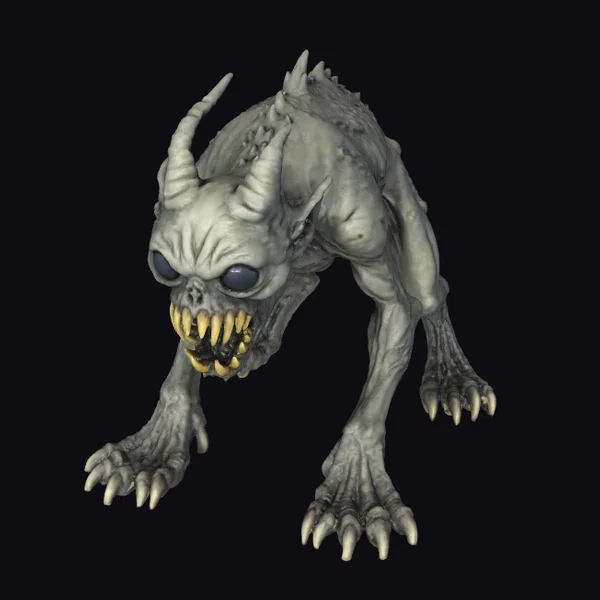 Perched on all fours, the creature’s muscular physique and sharp claws convey a sense of raw power and agility. Its gray skin appears almost skeletal, with visible ridges and bumps adding to its menacing appearance. The creature’s head is a twisted mass of sharp teeth and dark eyes, giving it a nightmarish quality. The long, curved horns on its head add to its fearsome visage. This 3D model would be perfect for use in dark fantasy games, horror animations, or as a design element for those who appreciate the macabre. Its detailed texture and realistic proportions make it an excellent choice for projects requiring a high level of realism.