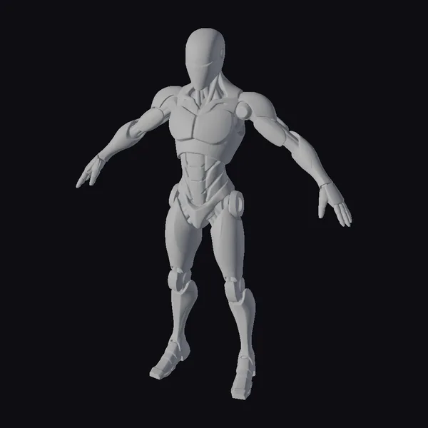 Standing with feet shoulder-width apart and arms extended outward, this gray metallic humanoid robot commands attention. The body is a blend of smooth and mechanical features, with a helmet-like head that covers the face except for a black, triangular opening. The robot’s pose suggests movement or balance, with a slight bend in the knees. The surface reflects light, highlighting its metallic composition. The darker gray accents add depth to the model, particularly around joints and the face. This robot can be used in various applications such as game development, virtual reality experiences, or as a design reference for futuristic characters and scenes.