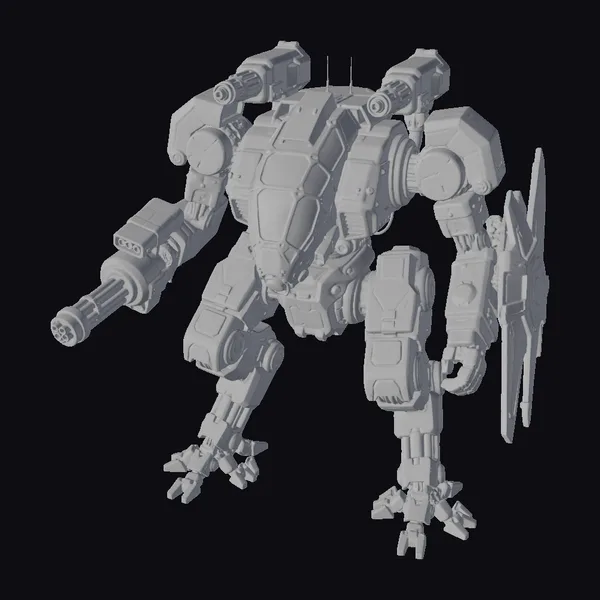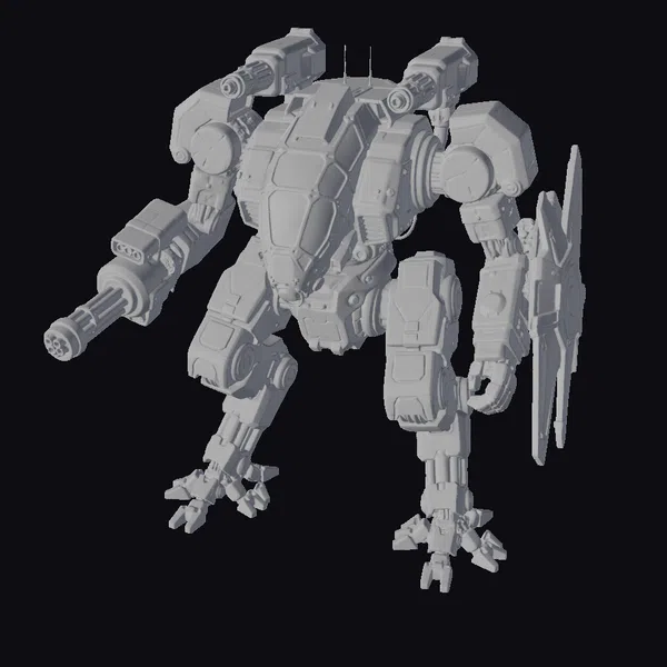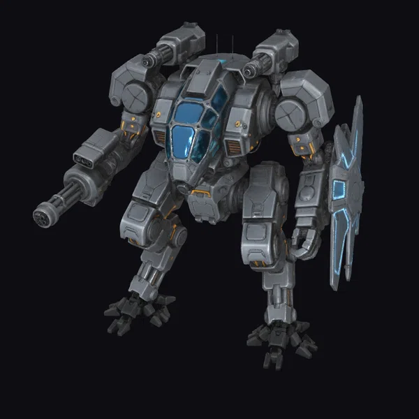 Standing tall with a robust build, this gray metal robot showcases a blend of industrial and futuristic aesthetics. Its body is a complex assembly of metallic parts, with blue-tinted sections that hint at the sophisticated technology embedded within. The robot’s right arm is equipped with a large gun, pointing forward as if prepared for immediate action. On its left side, a shield with a vibrant blue glow stands at the ready, adding to the robot’s defensive capabilities. The pose suggests dynamic movement, as if the robot is about to spring into action. The model’s intricate details make it an excellent choice for projects requiring a mech with a strong presence, suitable for use in games, 3D printing, VR/AR experiences, animations, and various design applications.