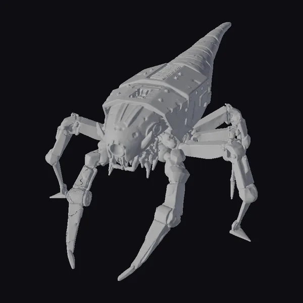 Detailed with precision, this low-poly robotic spider model showcases a blend of mechanical and organic features. Its elongated body is covered in metallic gray textures, punctuated by sharp, black claws and a distinctive long tail that tapers to a red tip. The head features a pair of glowing red eyes and a mouth full of sharp, dangerous-looking teeth. Positioned in a threatening stance, it appears ready to pounce. This model is perfect for use in sci-fi projects, video games, animations, or virtual reality experiences, offering a unique blend of technology and terror.