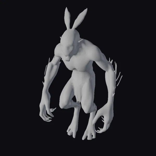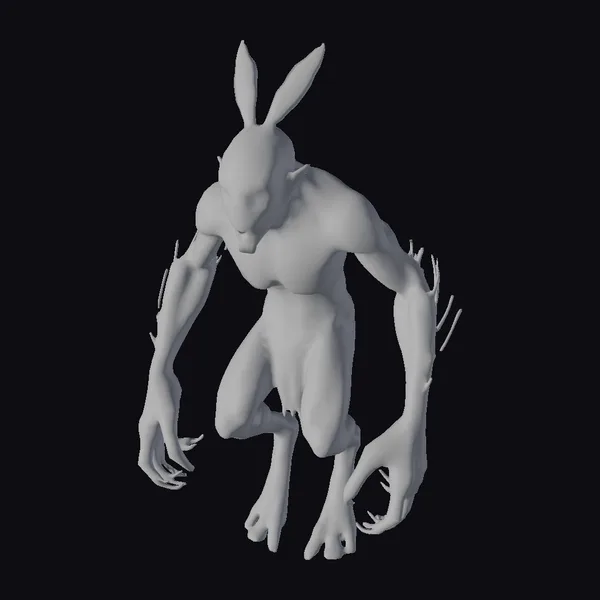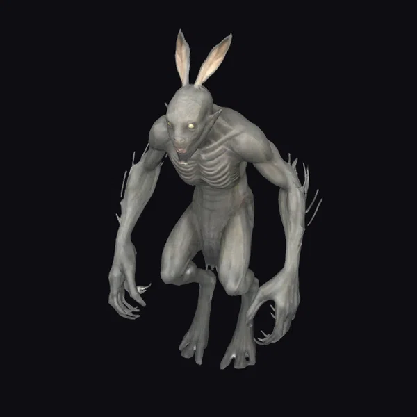 This creature stands poised in a crouched position, its muscular yet skeletal body a blend of terrifying and fascinating features. The gray texture of its skin, coupled with long ears reminiscent of a rabbit, gives it a unique yet unsettling appearance. Its glowing eyes are a stark contrast to the dark, grim texture of its body. Sharp claws on its hands suggest a readiness to pounce. Ideal for use in dark fantasy settings, horror scenes, or as a character in animations and games that require a mythical creature with a fearsome presence.