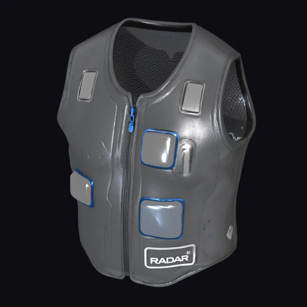 Wrapped in a sleek gray exterior, this smart vest boasts a futuristic design with blue accents and a prominent ‘RADAR’ label. Its modern aesthetic is accentuated by square patches and a mesh interior.