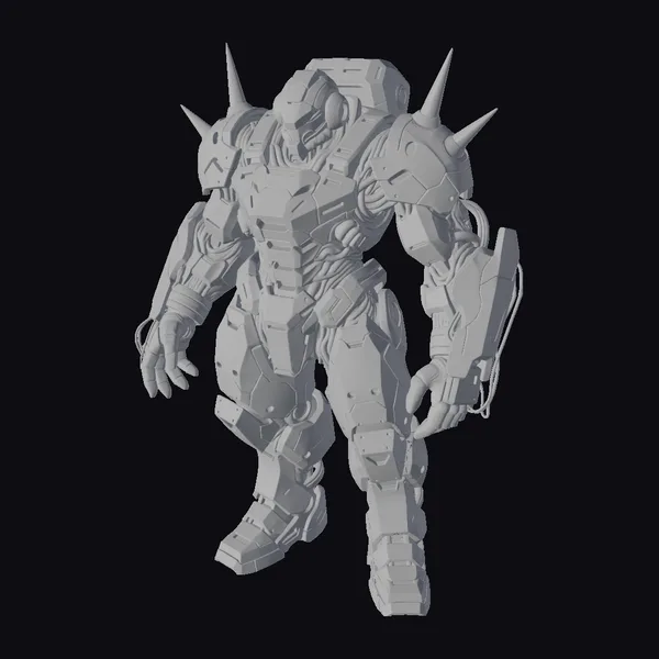 Detailed with precision, this mech suit model showcases a complex assembly of metallic parts, highlighted by its striking gray and red color scheme. The suit’s posture, with one leg forward and arm extended, suggests readiness for action. Its futuristic design, complete with spiked shoulders and a helmet, evokes a sense of advanced military or sci-fi narrative. Textures and lighting effects enhance its realistic appearance, making it suitable for high-quality animations, games, or virtual reality experiences. The model’s intricate details, from the mechanical limbs to the armor plating, offer a deep dive into a futuristic world of technology and warfare.