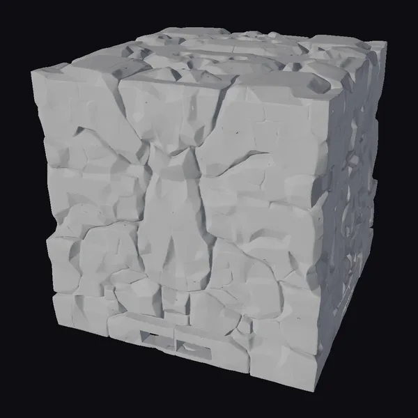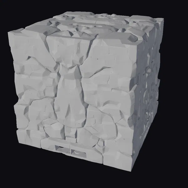 Perched on a stark white background, a gray rock terrain tile takes center stage, showcasing its intricate details. The modular design allows for seamless integration with other tiles, creating a vast, rocky landscape. The stylized rock face features deep cracks, jagged edges, and a rough texture, evoking a sense of ruggedness. Ideal for game developers, architects, and designers, this model can be used to create immersive environments for games, architectural visualizations, or VR/AR experiences.