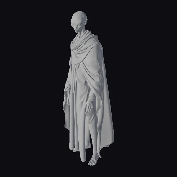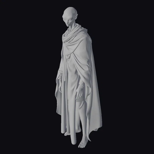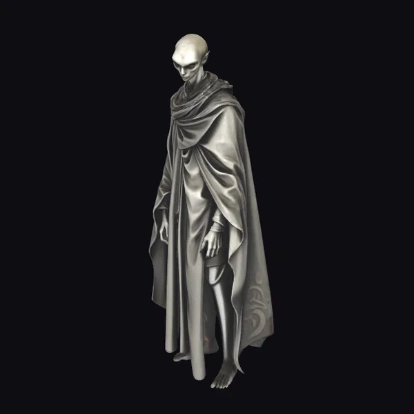 Standing tall with a subtle, stooped posture, this gray servant figure is a marvel of detailed design. The character’s bald head and bare feet contrast with the intricately draped cape and robe, which features a subtle pattern at the hem. The metallic gray coloration gives the figure a unique, otherworldly appearance. The servant’s face is devoid of features, adding to its enigmatic presence. This model is perfect for use in fantasy games, animations, or as a design element in virtual reality experiences, offering a versatile and intriguing character that can be integrated into various narratives.