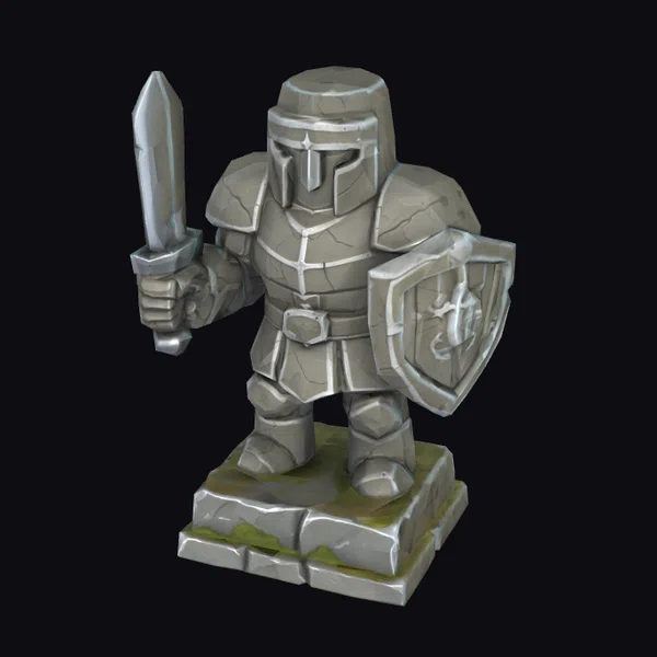 Standing guard with sword and shield, this charming stone knight exudes a sense of sturdy protection. Crafted in a stylized, low-poly style, its gray stone armor features a distinctive cross emblem on the shield. A small, moss-covered stone base adds a touch of natural weathering.
