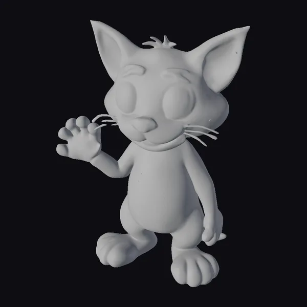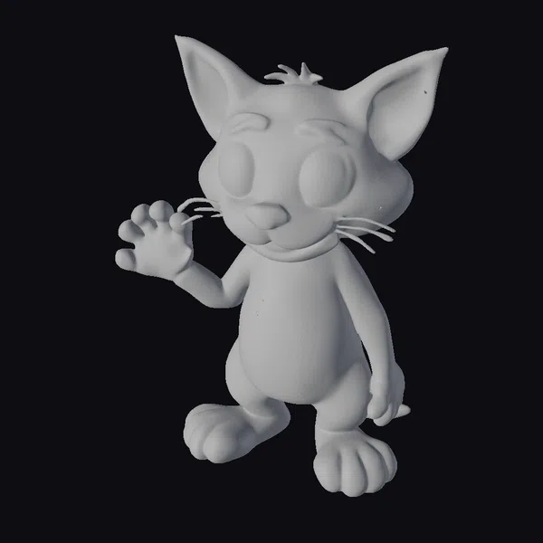 Detailed from its oversized ears to its expressive paws, this 3D model of a gray tabby cartoon cat exudes personality. The cat’s pose, with one paw raised as if waving, captures a moment of interaction. Its fur texture combines smooth and striped patterns in shades of gray and white, complemented by vibrant green eyes and a pink nose. The model’s stylized yet endearing features make it suitable for projects requiring a friendly, approachable feline character, such as animations, games, or children’s book illustrations.