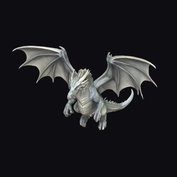 In a powerful stance, this magnificent creature stands ready to take flight or strike. Its wings, spread wide, showcase a delicate pattern of veins and tendons, while the body boasts a mesmerizing array of scales that gradate from light to dark gray. The dragon’s eyes seem to gleam with a fierce inner light, as if embers of fire burn within. A sense of dynamic movement is captured in the pose, as if the dragon might launch into the air or unleash a blast of fire at any moment. This model would be perfect for adding a touch of fantasy drama to games, animations, or 3D prints.